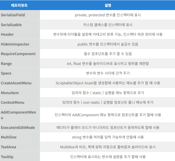 유니티에서 제공하는 Attribute를 이용하면 에디터를 커스텀 하는데 있어 편하게 진행할 수 있다.