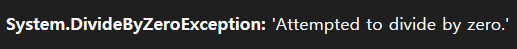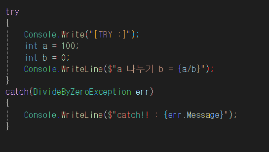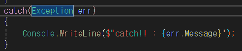 나는 0으로 나눌때의 예외를 처리하고 싶기 때문에 DivideByZeroException을 적어주었다.