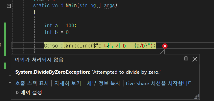try 부분은 똑같이 a에는 100 b에는 0을 넣고 나누어준다.
