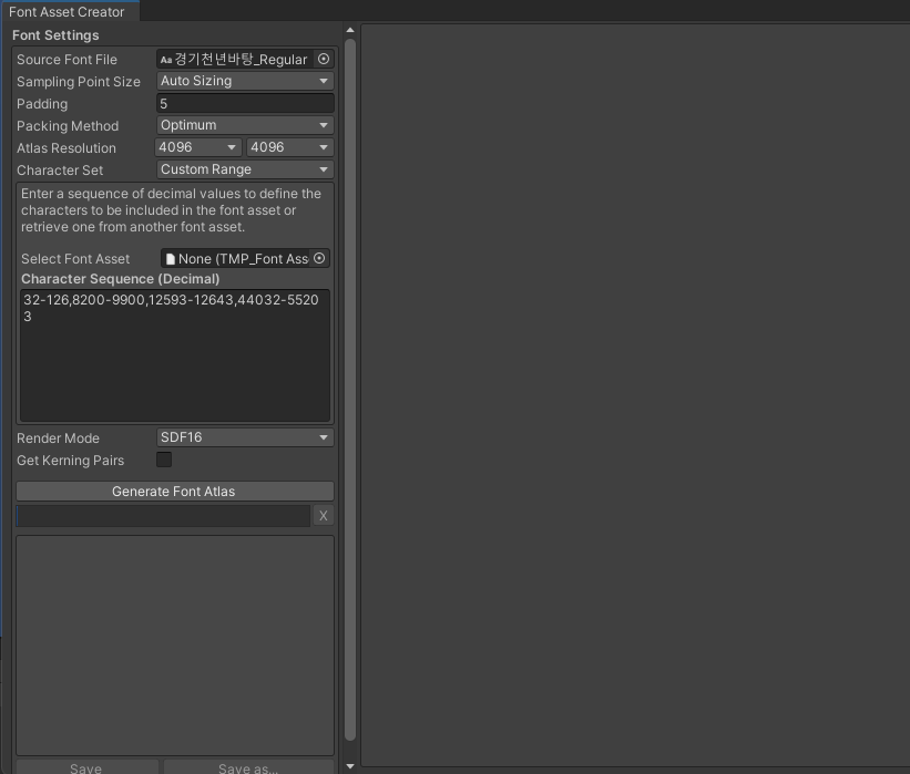 이런식으로 구성하고 Generate Font Atlas 버튼을 클릭해준다.