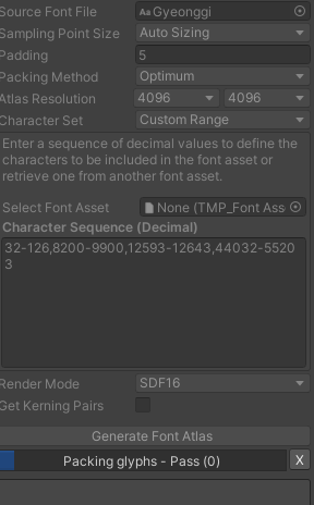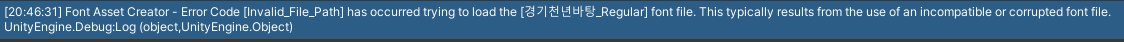 한글을 지원하지 않기 때문에 새로운 FontAsset 파일을 생성해줘야 한다.