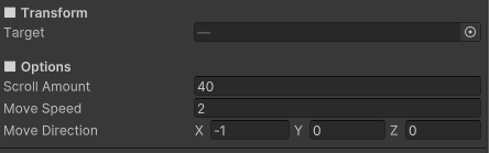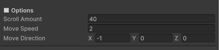 두 배경의 Option은 ScrollAmount는 40으로 MoveSpeed는 2로 MoveDirection은 왼쪽으로 이동할거니깐 x = -1로