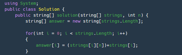 n번째 글자를 맨 앞에 놔두면 Array.Sort()를 이용해 순식간에 오름차순으로 정렬시킬수있다.