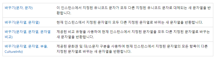 인스턴스에서 지정된 문자 혹은 문자열이 모두 다른 지정된 문자열로 바뀌는 새 문자열을 반환한다.