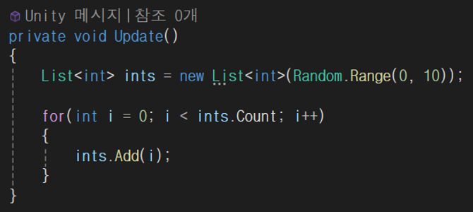 당연하다 Update()문 내에서 클래스나 리스트를 할당하는건 굉장히 안좋은 선택이다.