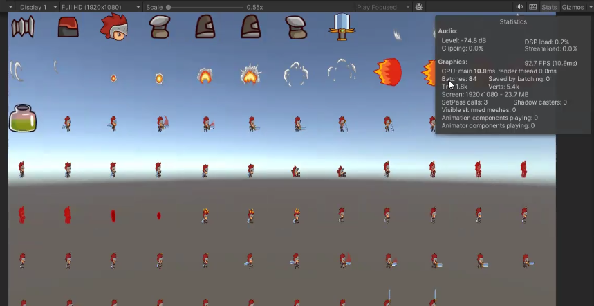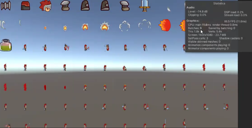 하지만 아틀라스로 묶어둔 이미지들을 올리면 Batches가 확 줄어든 모습을 볼 수 있다.