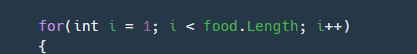 일단 첫번째 반복문을 만들어 주자 food[0]은 물이니까 당연히 i는 1부터 시작한다.