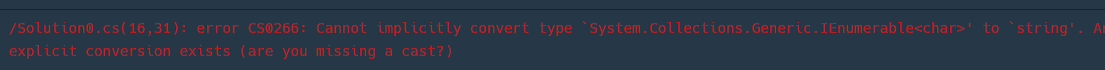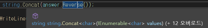 아하 answer.Reverse()녀석은 IEnumberable<char> 라는 형식이라고 한다... 다 같은 char가 아니였구나...