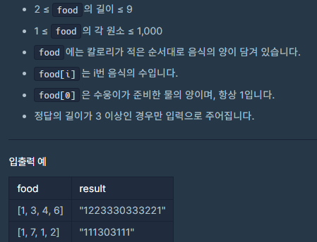 즉 food[0]은 물이니깐 food[1] ~ 새야하는데 양쪽에서 같은 음식을 먹어 치우면서 가기 때문에 홀수의 음식은