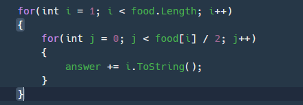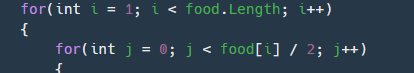 두번째 반복문도 만들어준다 특이하게 j는 0부터 시작해서 food[i]번째 인덱스의 절반 값만큼 반복문을 돌게된다.