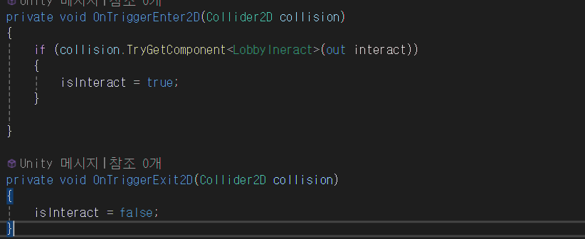 Trigger충돌한 물체 collision에서 TryGetComponet로 아까 만들어둔 LobbyInteract 컴포넌트를 가져온다.