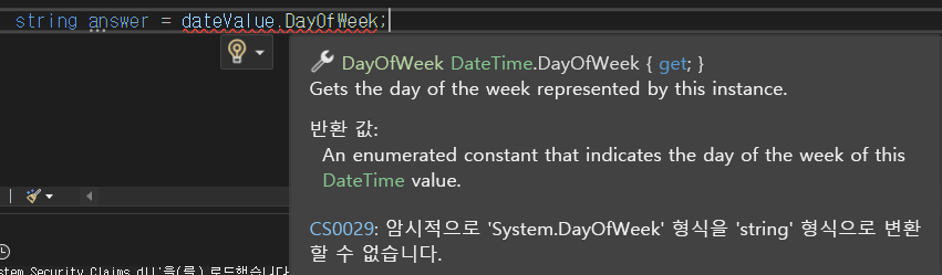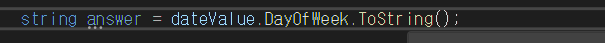 dateValue.DayofWeek는 형식이 string이 아니기때문에 string 형인 answer에 바로 넣어줄수가없다