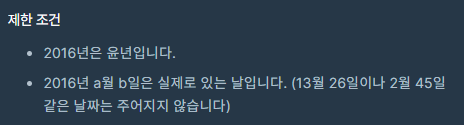 문제를 보자 2016년 a월 b일은 실제로 있는 날 이라고 하는게 이런 뜻이었나 보다