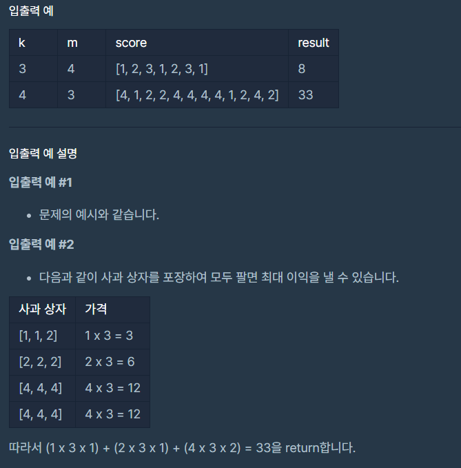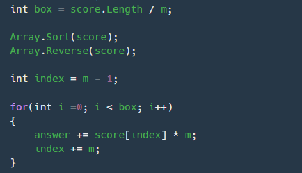 이렇게 하면 score의 인덱스를 순서대로 돌면서 m개씩 담게되면 내가 만든 사과상자의 가격이 위의 이미지의