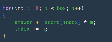 index에는 반복문을 돌때마다 m만큼을 더해줘서 다음 상자에 담길 최소등급의 사과를 가져올수 있게 해주자