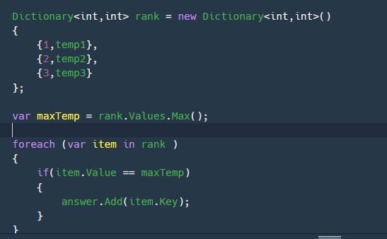 foreach문을 돌면서 각 item의 Value가 maxTemp의 값이랑 같다면 answer에 넣어주고 리턴해주도록하자