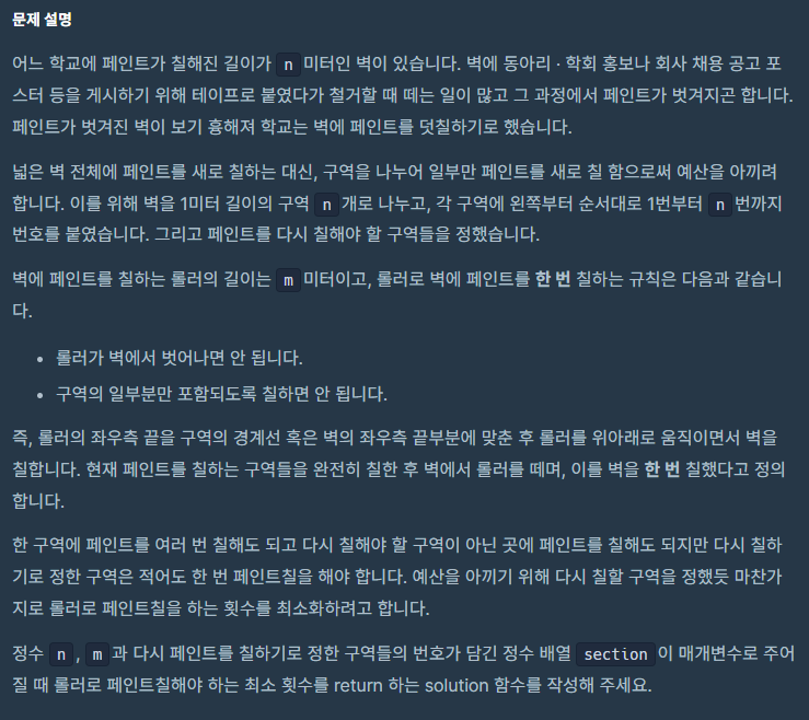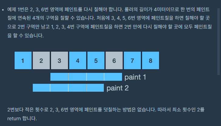 사실 나도 처음엔 paint의 위치를 section[i] + m 으로만 계산해서 문제를 틀렸는데