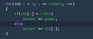 atk[i]가 limit보다 크다면 answer에 power를 더해주고 아니라면 atk[i]를 더해주면서