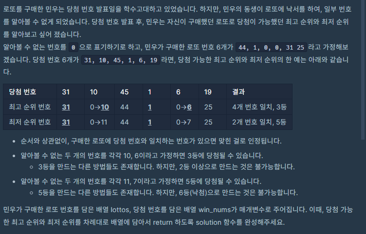 로또의 최고 순위와 최저 순위라는 알고리즘 문제를 풀어보았다.