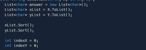 후딱 작성해주었다 문자열 X와 Y를 담아줄 '문자' List인 xList , yList를 만들어주고 미리 오름차순으로 정렬하도록 하자